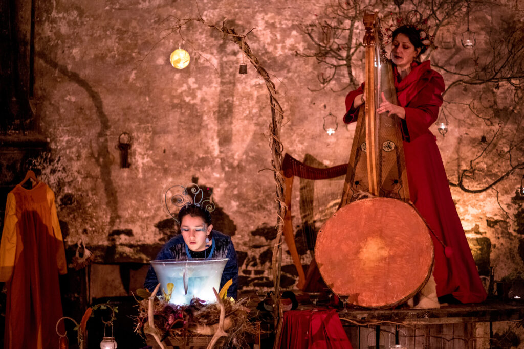 Pour le thème, nous avons choisi de consacrer l’esprit du solstice d’hiver (ïazel, en Kyjelïa) au féminin sacré, avec un spectacle créé et joué par une équipe entièrement féminine. Le décor nous a été inspiré par le lieu lui-même et nous avons donné libre cours à nos envies de féerie. Pour les costumes, nous avons utilisé les mêmes que pour le Spectacle d’été « Des bulles et des plumes » mais adaptés aux rigueurs de la Salle Au Duc en hiver.